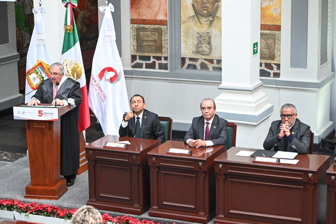 Diputados y diputadas locales, encabezados por los legisladores José Francisco Vázquez Rodríguez y Maurilio Hernández González, presidentes de la Junta de Coordinación Política y de la Directiva de la LXII Legislatura mexiquense, respectivamente, asistieron al Quinto Informe Desarrollo Estratégico 2024 del magistrado Ricardo Sodi Cuellar, titular del Poder Judicial estatal y presidente del Tribunal Superior de Justicia del Estado de México.