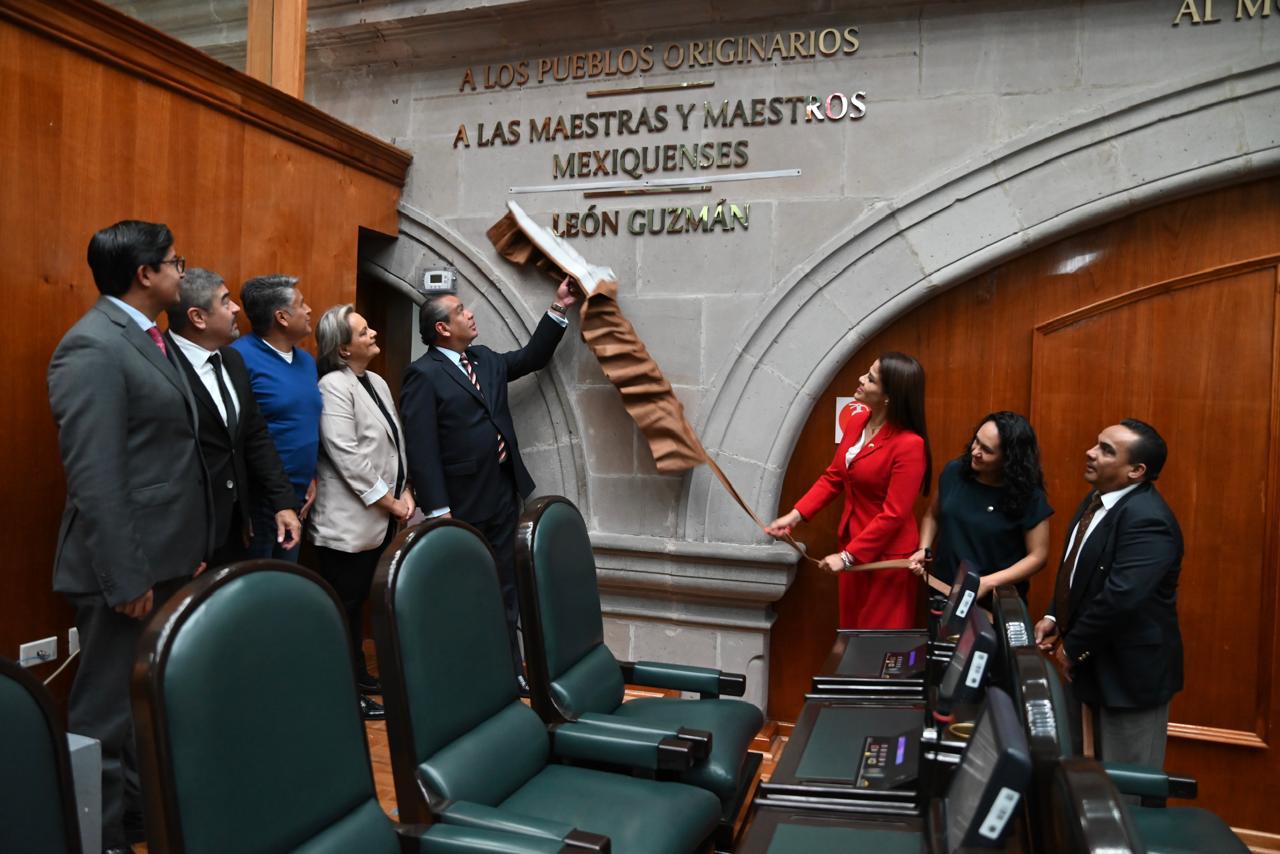 La diputada Karla Aguilar Talavera y el diputado Jesús Gerardo Izquierdo Rojas develaron en el Muro de Honor del Salón de Sesiones “José María Morelos y Pavón” del Congreso local el nombre de León Guzmán con letras doradas, como un testimonio de gratitud y reconocimiento permanente por su importante labor en favor de la nación y la entidad.