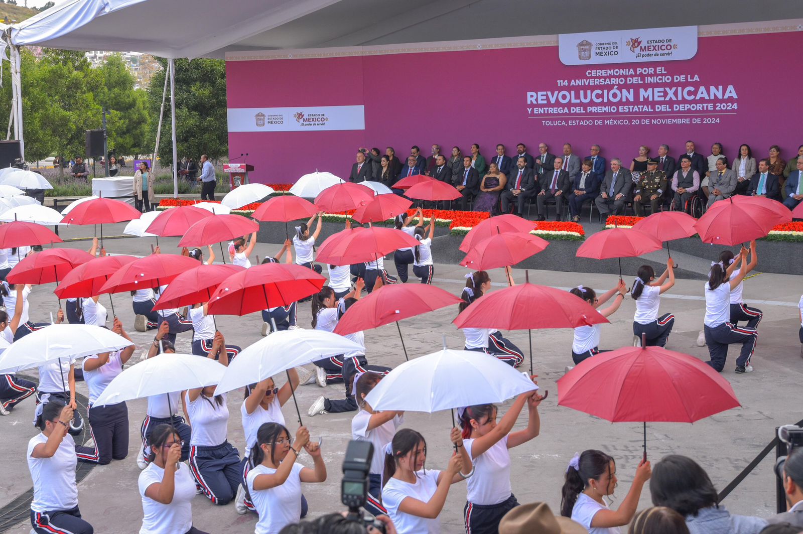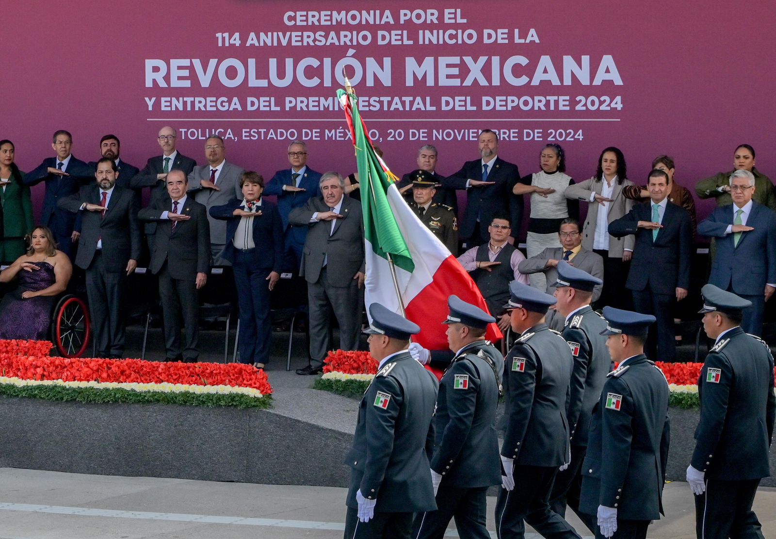 Los diputados José Francisco Vázquez Rodríguez y Maurilio Hernández González, presidentes de la Junta de Coordinación Política y de la Directiva de la LXII Legislatura mexiquense, asistieron a la ceremonia por el 114 aniversario del inicio de la Revolución Mexicana (20 de noviembre de 1910) y entrega del Premio Estatal del Deporte 2024, evento que fue encabezado por la gobernadora Delfina Gómez Álvarez.
