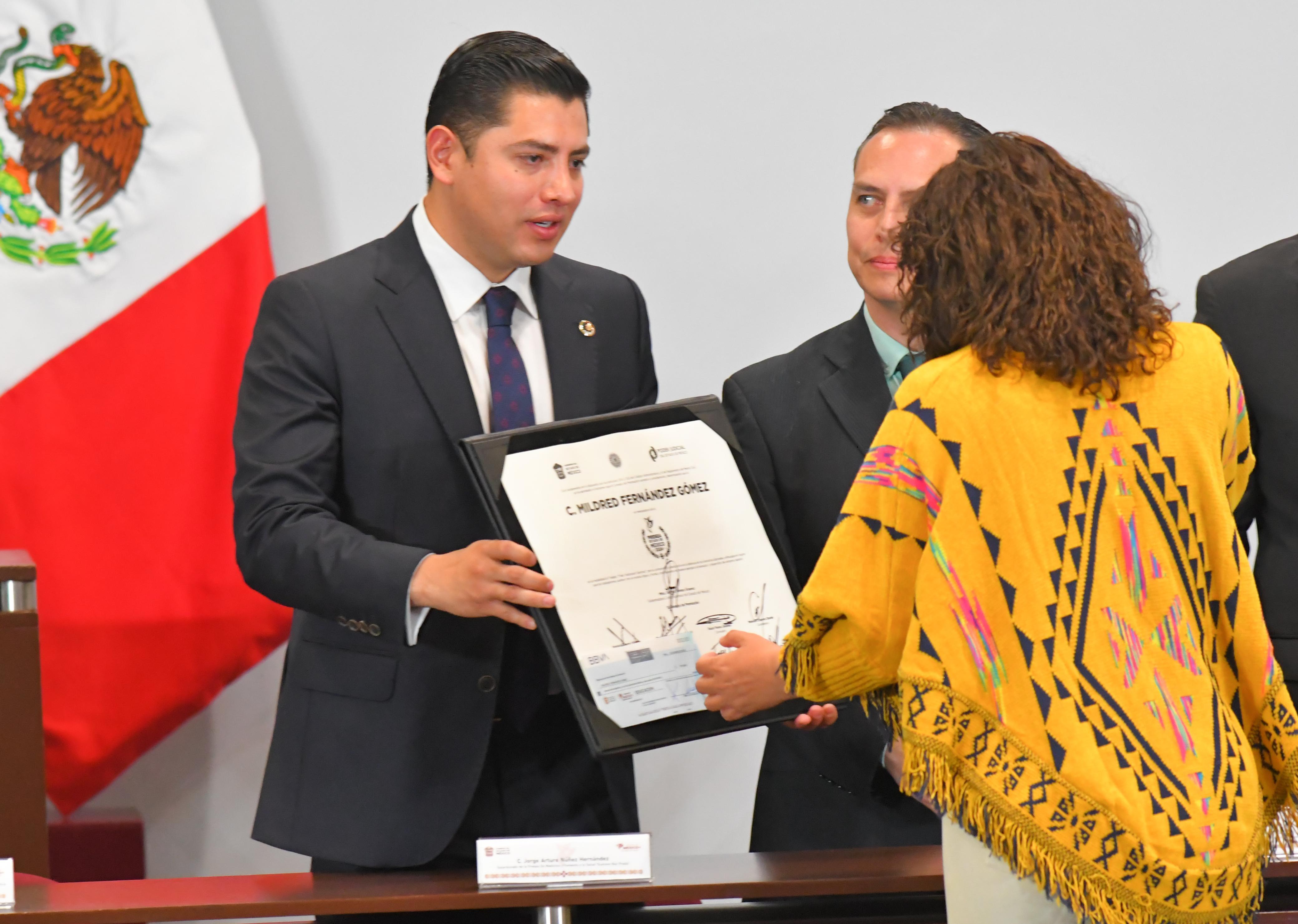 Durante la ceremonia, a la que también asistieron legisladoras y legisladores de distintos grupos parlamentarios, la mandataria develó una placa alusiva con los nombres de los galardonados, en compañía de Marath Baruch Bolaños López, secretario del Trabajo y Previsión Social y representante de la presidenta Claudia Sheinbaum Pardo; Horacio Duarte Olivares, secretario general de Gobierno; y Fernando Díaz Juárez, magistrado presidente del Tribunal Superior de Justicia del Estado de México.