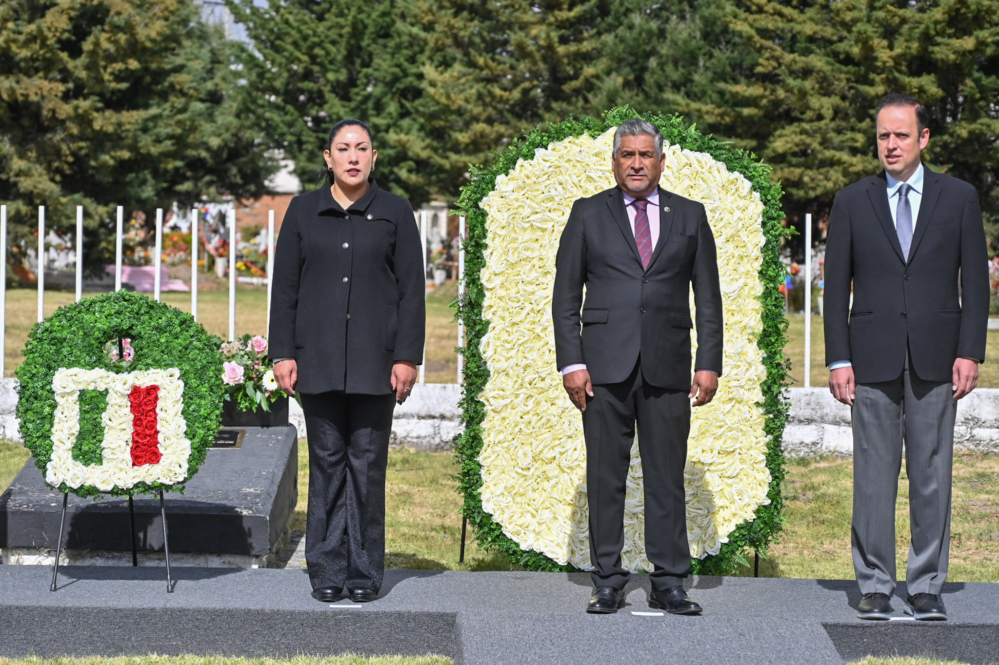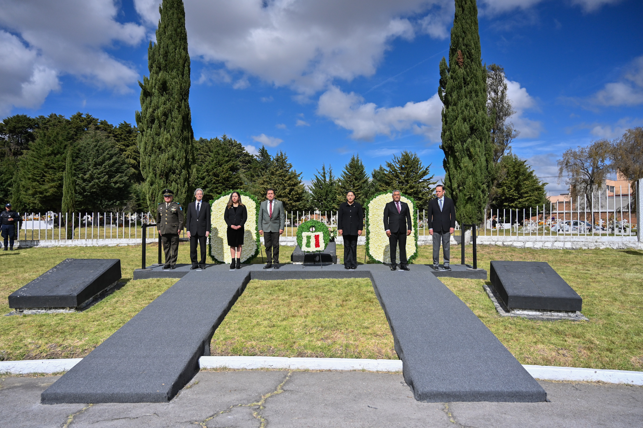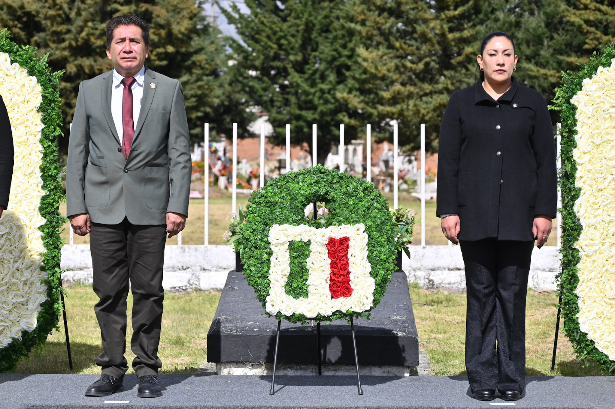 En el marco del vigésimo aniversario luctuoso del exgobernador Jorge Jiménez Cantú (1914-2005), la diputada Martha Azucena Camacho Reynoso (morena), presidenta de la Directiva del Congreso mexiquense, y el legislador Gerardo Pliego Santana (morena) participaron en la ceremonia cívica y guardia de honor en memoria del exmandatario, realizada en la Rotonda de Personas Ilustres, en el Panteón Municipal de Toluca.