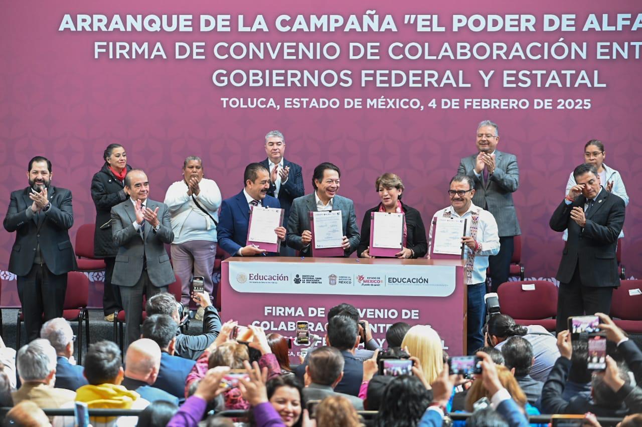 Durante el evento, que contó con la presencia de Mario Delgado Carrillo, secretario de Educación Pública de México, se celebró la firma de convenio de colaboración entre los gobiernos federal y estatal, para que la Secretaría de Educación, Ciencia, Tecnología e Innovación, en coordinación con Instituto Nacional para la Educación de los Adultos y los Servicios Educativos Integrados al Estado de México, alfabetice a personas jóvenes y adultas para mejorar su calidad de vida.