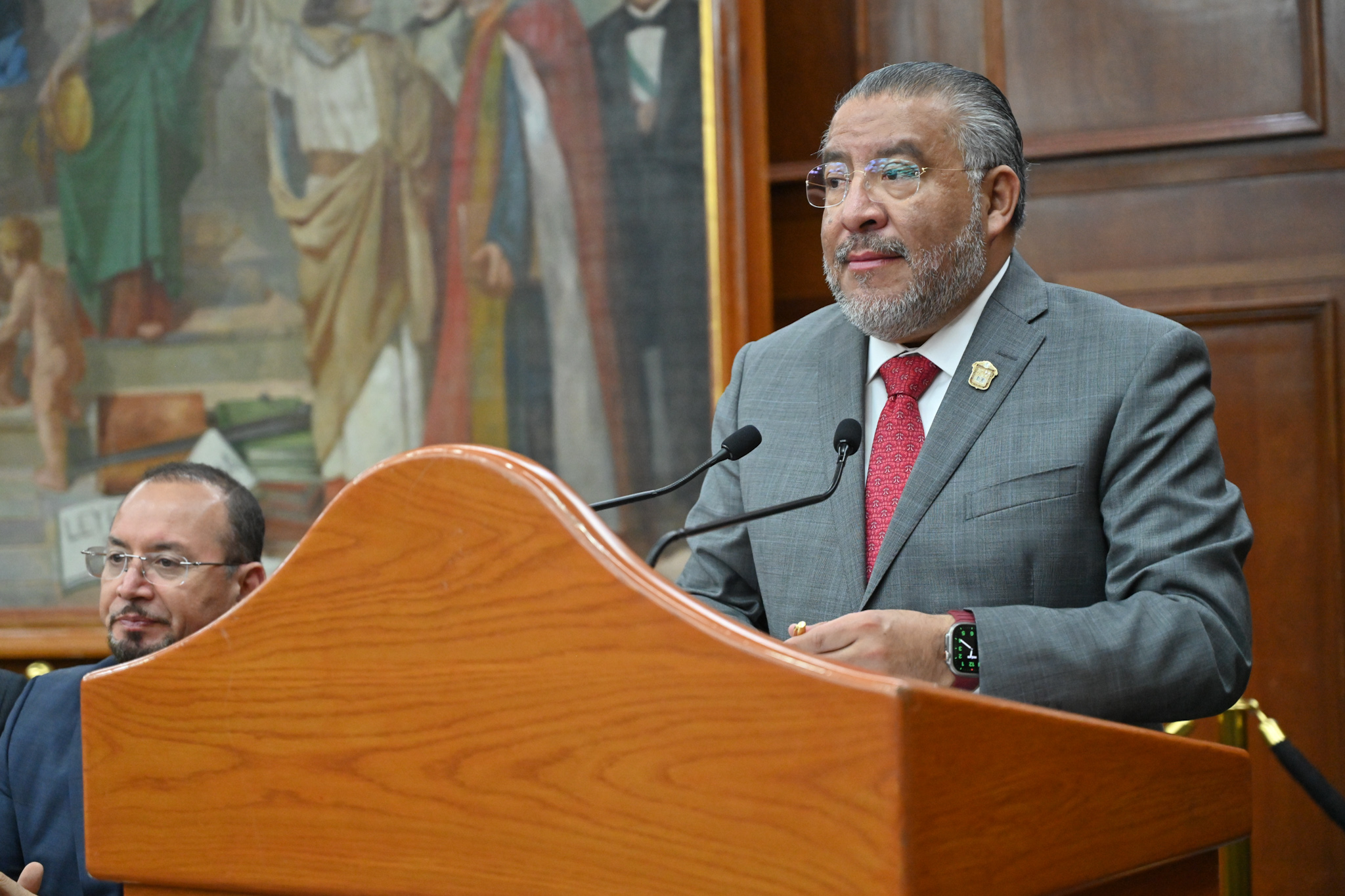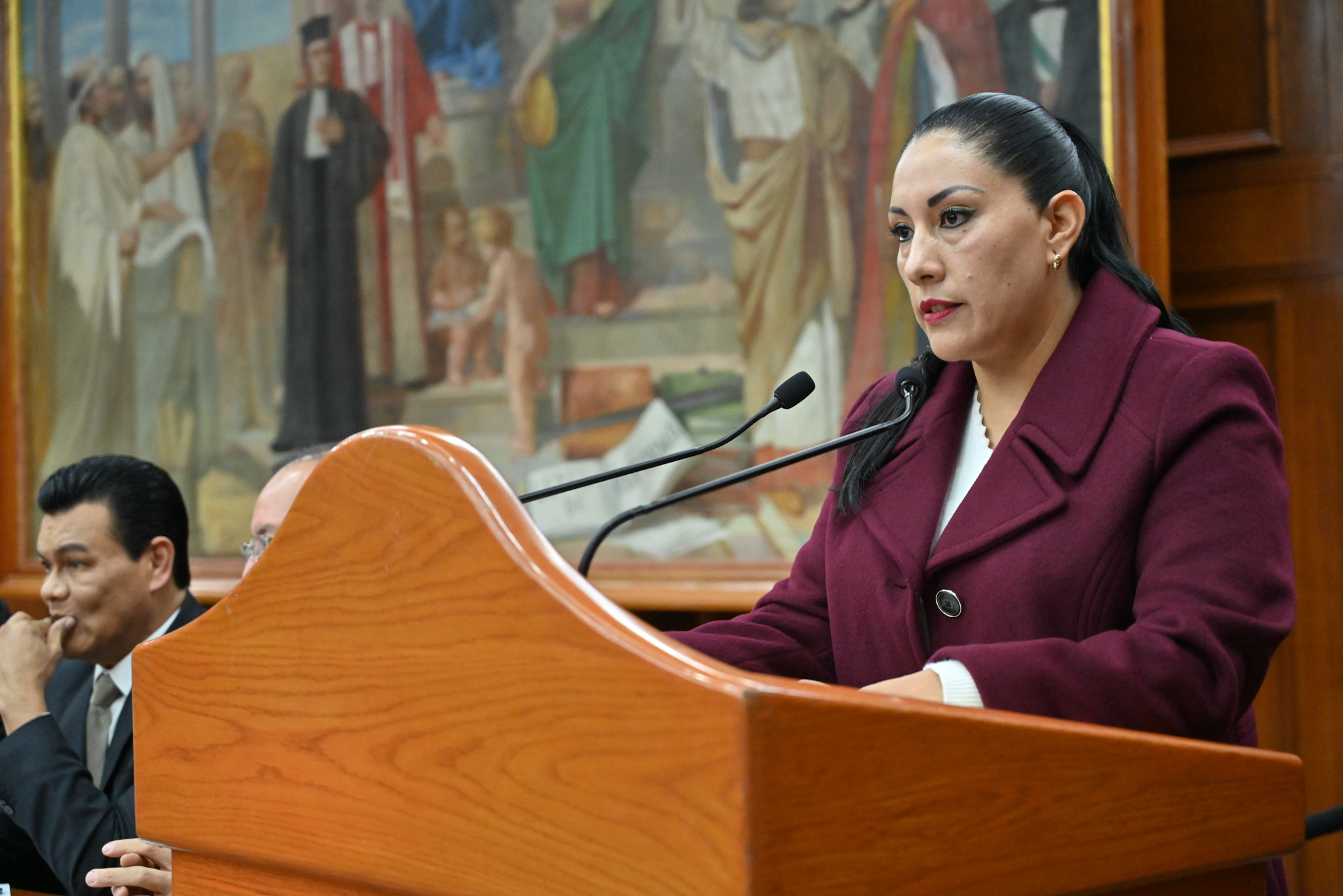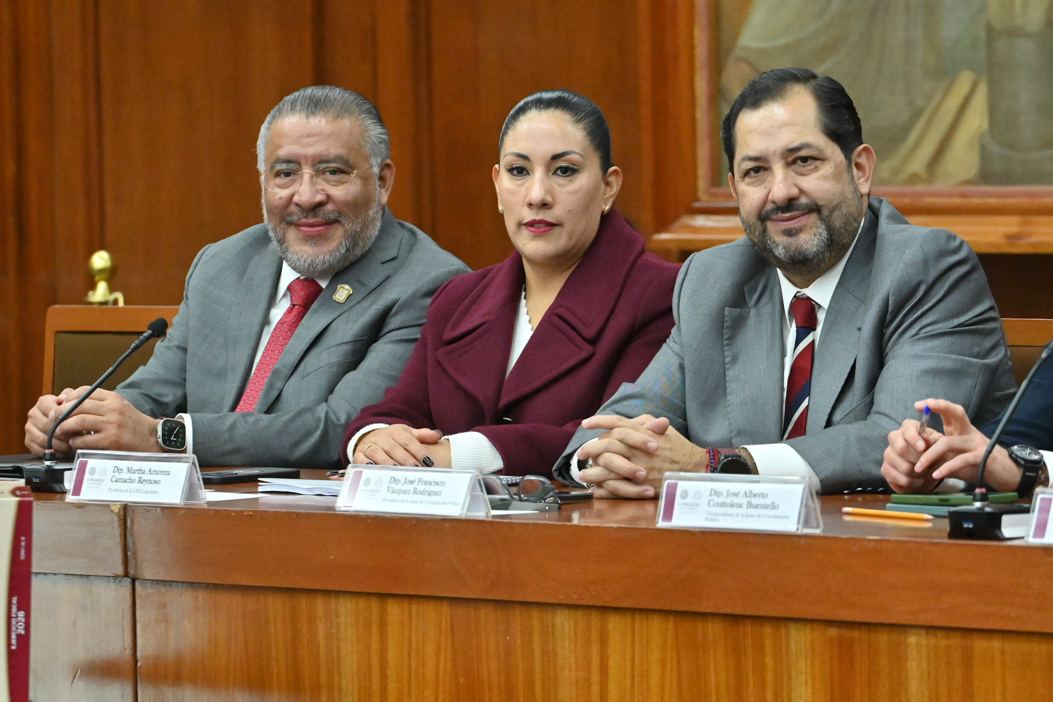 En presencia de los legisladores José Alberto Couttolenc Buentello (PVEM), Elías Rescala Jiménez (PRI), Oscar González Yáñez (PT), Pablo Fernández de Cevallos González (PAN), Juan Manuel Zepeda Hernández (MC) y Omar Ortega Álvarez (PRD), todos integrantes de la Jucopo, la diputada Martha Camacho destacó que la entrega simboliza la fortaleza de las instituciones, la vigencia del Estado de derecho y el compromiso irrenunciable de la Legislatura con la transparencia, la responsabilidad hacendaria y el bienestar del pueblo.