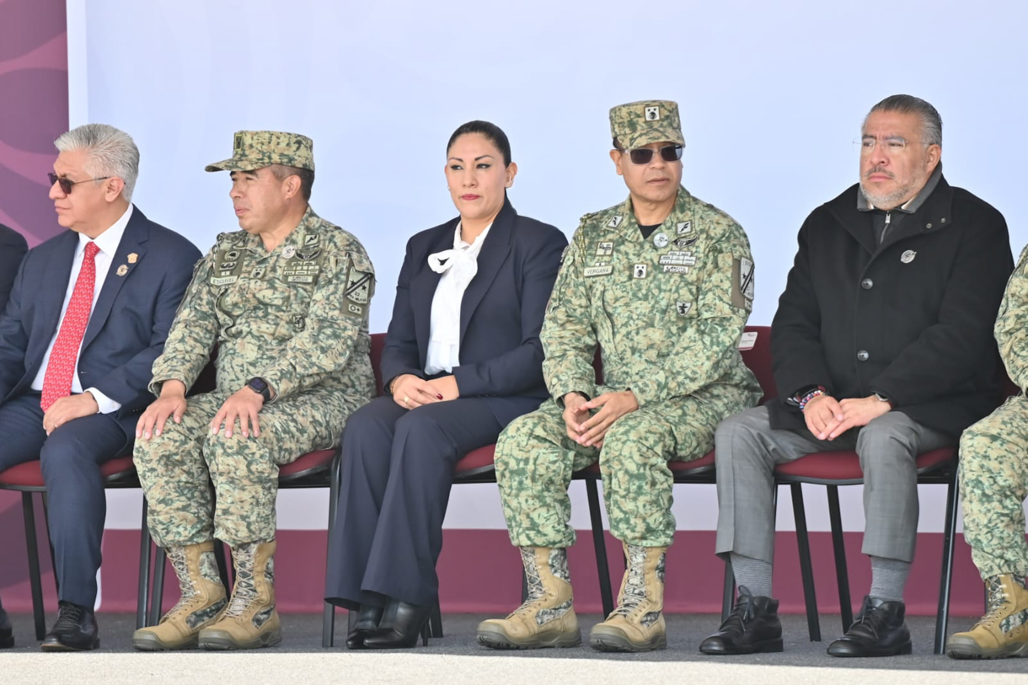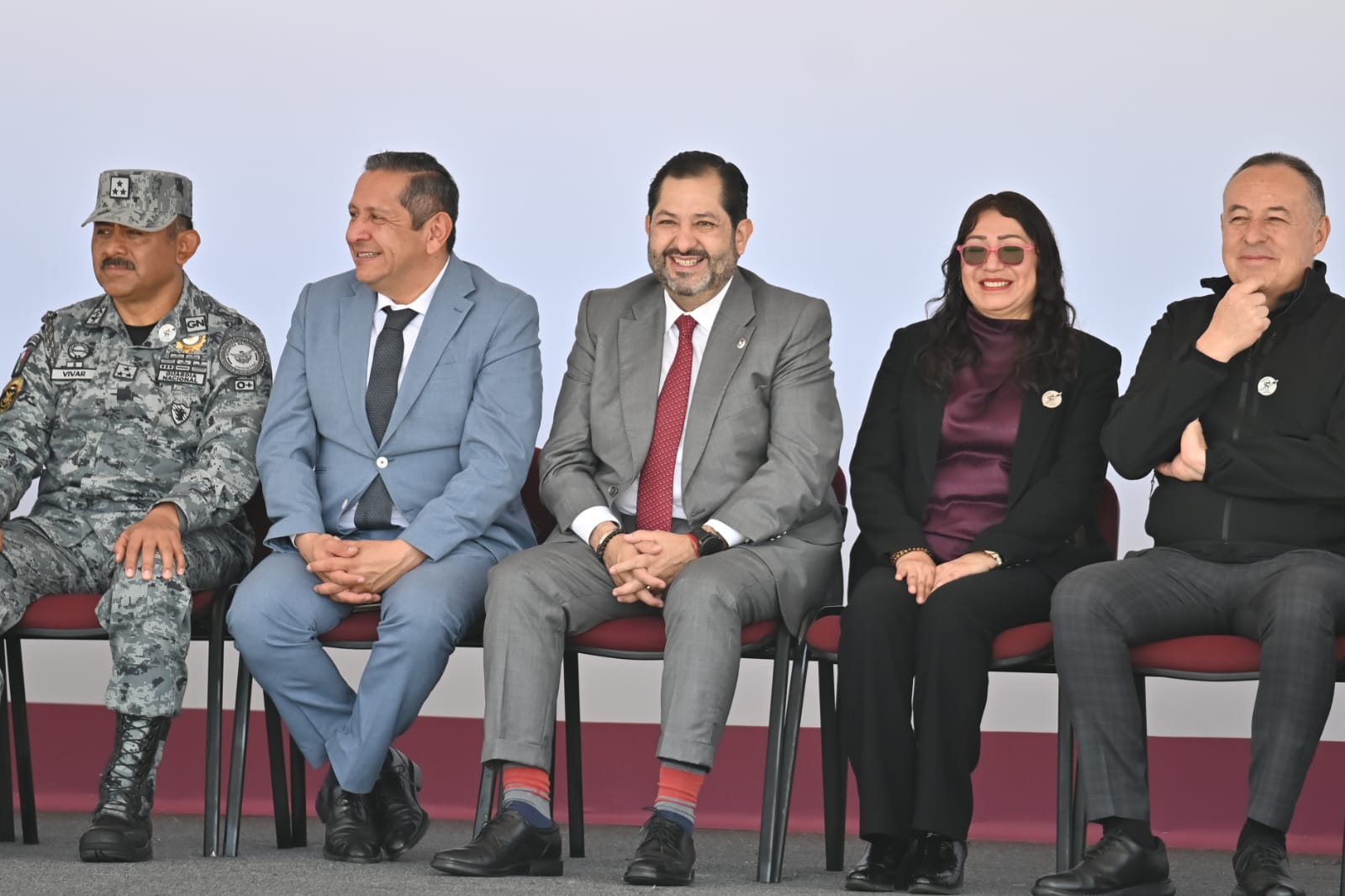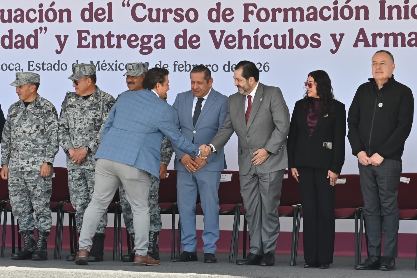 El diputado José Francisco Vázquez Rodríguez (morena), presidente de la Junta de Coordinación Política de la LXII Legislatura mexiquense, y la diputada Martha Azucena Camacho Reynoso (morena), presidenta de la Directiva, asistieron a la ceremonia de graduación del ‘Curso de Formación Inicial para Policía de Proximidad’ y la entrega de vehículos y armamento, actos encabezados por la gobernadora Delfina Gómez Álvarez, quien fue acompañada por mandos militares y representantes de la Guardia Nacional.