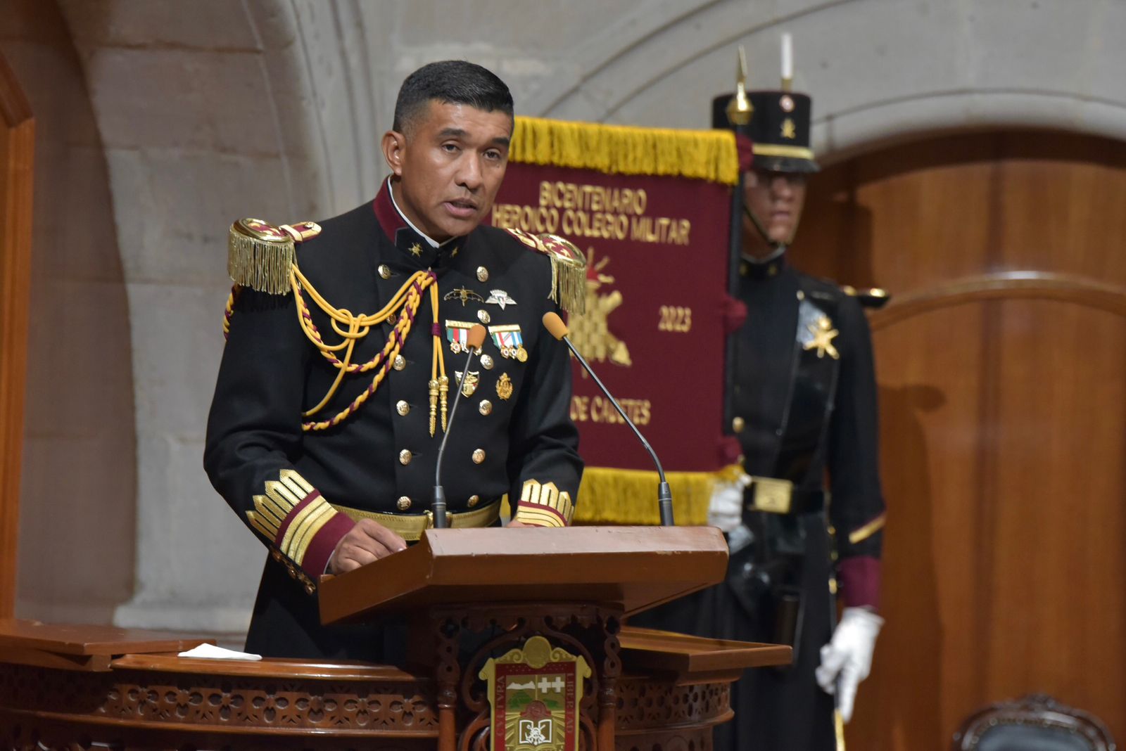 En sesión solemne, en el marco de la conmemoración del año del bicentenario del Heroico Colegio Militar, ante Víctor Hugo Serrano Estrada, coronel de infantería Diplomado del Estado Mayor, comandante del Cuerpo de Cadetes del Heroico Colegio Militar, y Jorge González Gálvez, comisariado de la Guardia Nacional, la legisladora María Luisa Mendoza destacó el papel del insigne plantel educativo, fiel ejemplo de disciplina y vocación de servicio, que ha sido semillero de nobles convicciones y grandes estrategas.